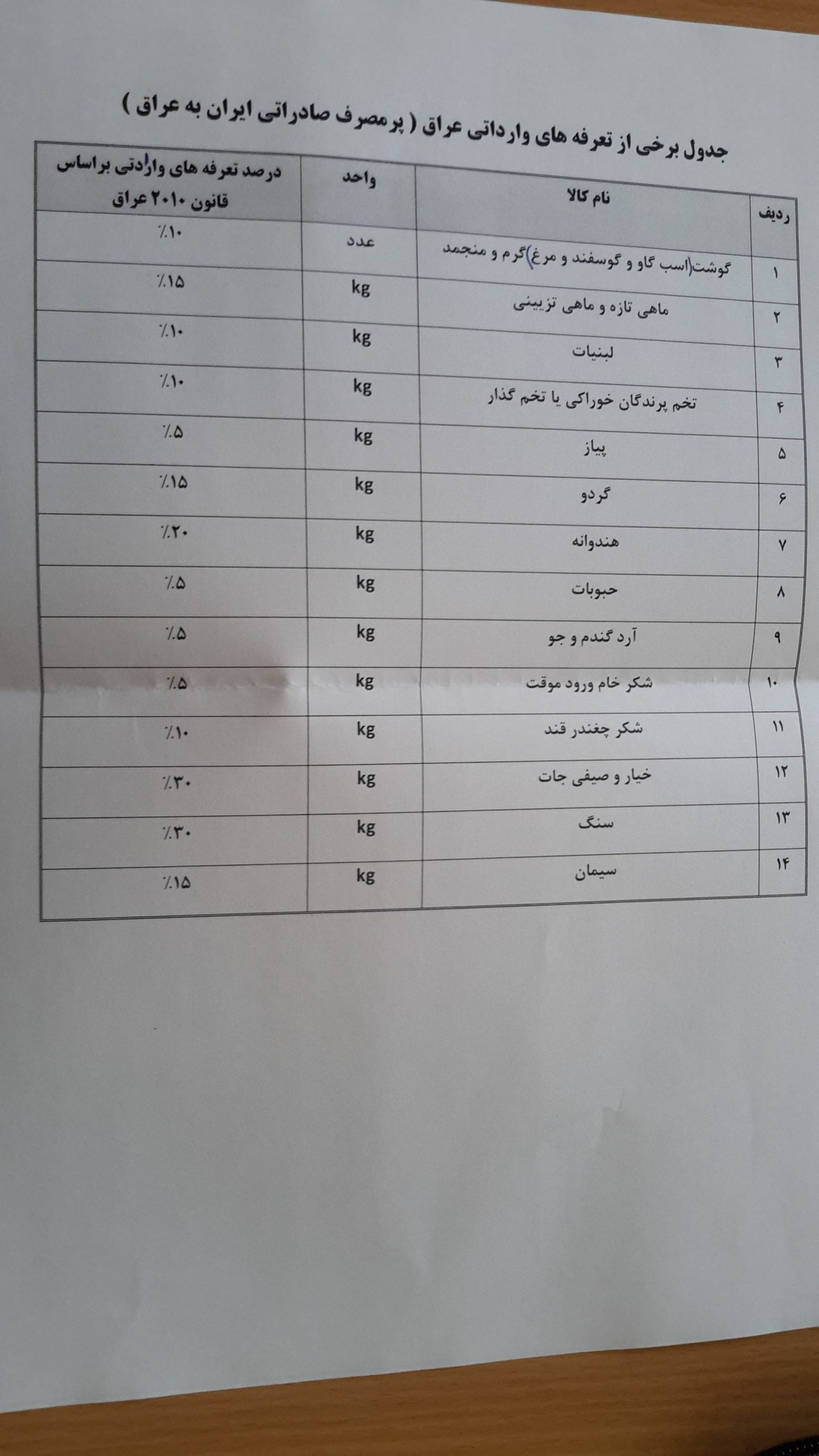 تعرفه های جدید وارداتی درعراق که در سال ۲۰۱۰ میلادی تصویب شده و دولت عراق قصد دارد که آنها را به اجرا بگذارد ، بنابراین تجار ایرانی بایستی تدابیر لازم را بر این اساس اتخاذ نمایند. (۰۳/ ژوئیه /۲۰۱۵) تعرفه های جدید وارداتی درعراق ۲۰۱۰ میلادی